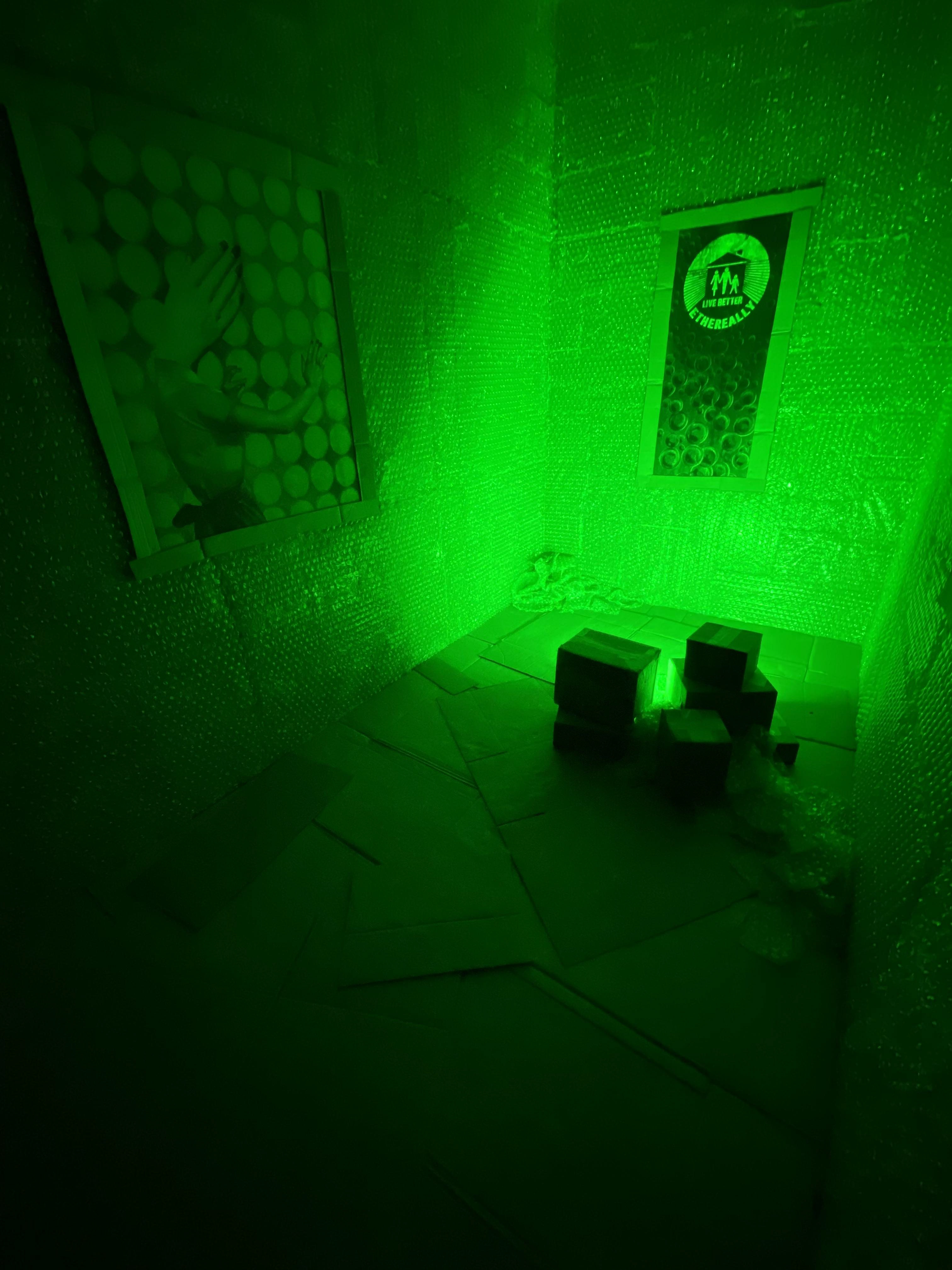 For theming, I made some bespoke iconography-inspired Ethereum-themed collages; added some intense green lighting found in the convention’s storage closet. 300 billion staples later, and the unexpectedly popular “Live Better Ethereally Super Secret Bubble Wrap Room” was born. It was a place for EthDenver’s Hackers to de-stress (if they were curious enough to find it…there was no signage and the only thing that led there was a thin neon green tape line on the floor). The best part: the whole thing got recycled at the end of the convention…except for the staples, which live in the walls to this day.